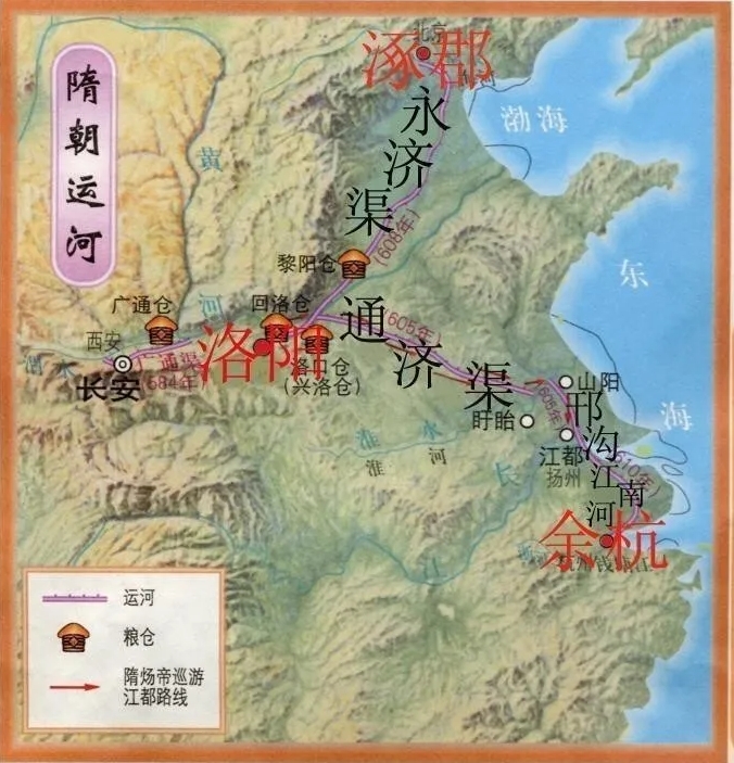 隋炀帝即位就下令调征河南、淮北诸郡人民百多万人修通济渠,西段自洛阳西苑引谷水、洛水循阳渠故道,东段走汴渠故道入淮水,他还征发淮南民工十多万人修东汉陈登所开的邗沟直道,自山阳至杨子入长江,渠宽四十步,两旁皆筑工整平坦的御道,夹种杨柳。从长安到江都,修建离宫四十多座。接着,他派人到江南造龙舟和杂船数万艘。 |