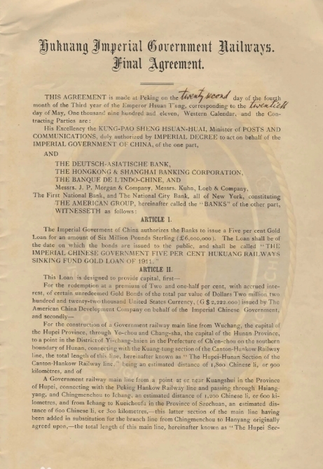二十二日(1911.5.20)由清政府邮传大臣盛宣怀代表清政府与英、法、德、美四国银行团代表在北京签订《粤汉川汉铁路借款合同》二十五款。 主要内容为: 1、四国银行借款六百万英镑予清政府用于修建湖广铁路,利息伍厘; 2、该借款合同以湖北百货厘金、江防经费等作为抵押,不使用路权作为抵押; 3、合同约定此铁路建造工程及管理一切之权全归大清政府,但路段总工程师需由外国人担任,除钢轨由汉阳钢铁厂供应外,其他材料优先由国外采购。 |