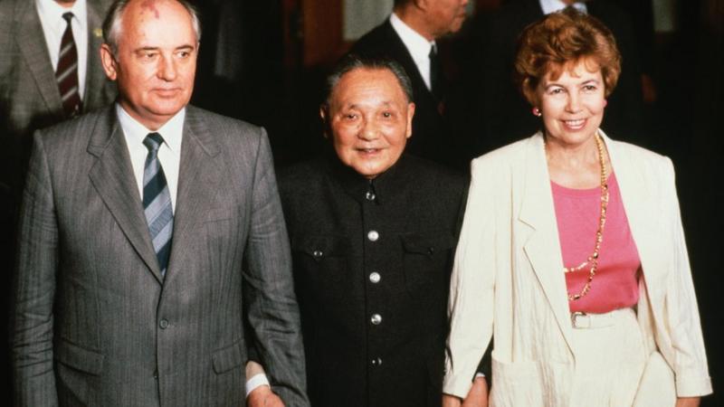 戈尔巴乔夫夫妇访华时和中国领导人邓小平牵手合影。