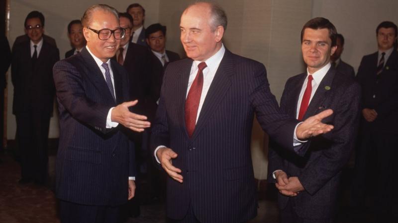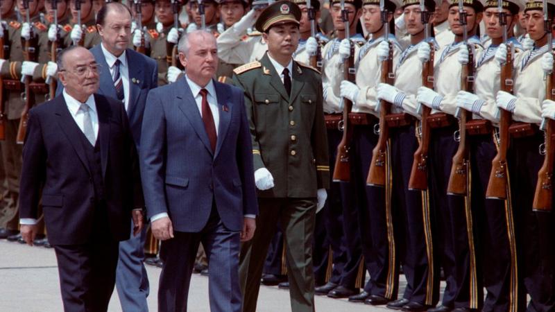时任中国国家主席杨尚昆在机场举行欢迎仪式迎接戈尔巴乔夫 戈尔巴乔夫与时任中共总书记赵紫阳和中共中央军委主席邓小平分别举行会晤,实现了当时苏共和中共的关系正常化。