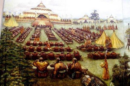铁木真去世后,铁木真三子窝阔台,面对家族诸子中以军事实力、威信和智慧著称的四弟拖雷,引用蒙古人幼者继承祖业的老规矩,暂时婉拒了自己的即位事宜,反而力推拖雷先行监国。 在重臣耶律楚材和铁木真二子察合台以及一些蒙古贵族的强烈要求下,监国两年的拖雷,不得不按照蒙古人的风俗习惯和铁木真的遗命,召开了由蒙古各宗王、部落首领参加的“忽里勒台”大会,商议并推举蒙古大汗。 在哈拉和林的万安宫,窝阔台大汗即位仪式举行。 |