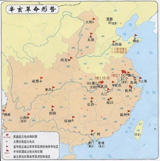 1911年夏天,湘、鄂、粤、川等省爆发保路运动,运动在四川省尤其激烈。9月25日,荣县独立,成为全中国第一个脱离清王朝的政权,把保路运动推向高潮。10月10日晚,新军工程第八营的革命党人熊秉坤打响武昌起义的第一枪。汉阳、汉口的革命党人分别于10月11日夜、10月12日攻占汉阳和汉口。起义军掌控武汉三镇后,湖北军政府成立,黎元洪被推举为都督,改国号为中华民国。武昌起义胜利后短短两个月内,湖南、广东等十五个省纷纷宣布脱离清政府独立。